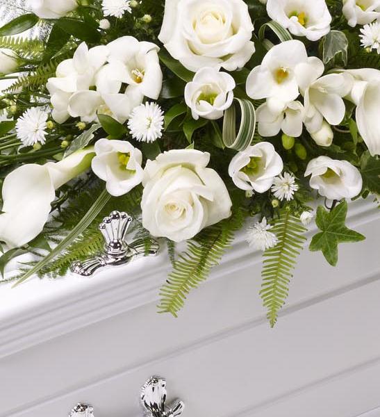 The selection of stunning flowers in snow white shades gives grace and simplicity to this casket spray. The design features calla Lily, sweetly scented freesia, large-headed roses, lisianthus and September flowers, arranged with ruscus, China grass, ferns and ivy trails.