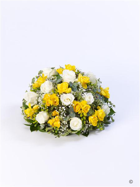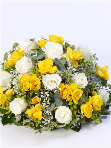 Roses and scented freesia in yellow and white are nestled amongst choice foliage in this classic posy design.